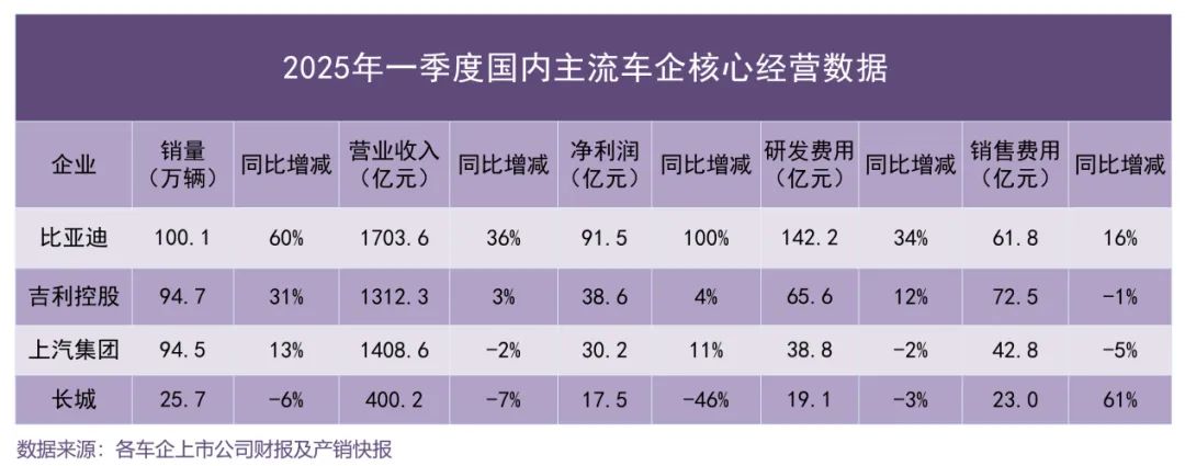 从国内头部车企的一季报来看,研发投入的高低直接决定了企业经营情况。比亚迪、吉利等车企凭借不断加码的研发投入,带来销量、营收、利润的“三赢”,其中比亚迪更是凭借多年的研发重投入实现利润的翻倍增长。相对削减研发、重视营销的长城则在核心经营指标出现不同程度下滑,利润下滑超四成至17.5亿元。