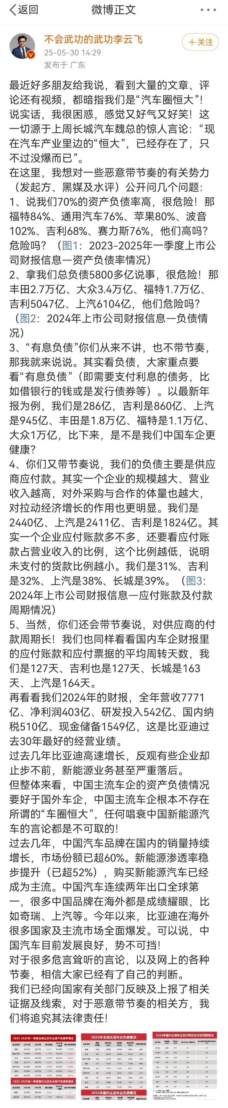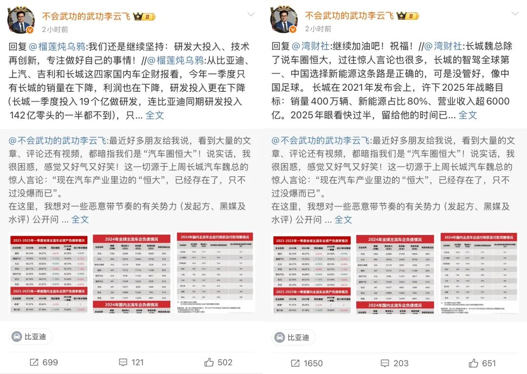 近日,比亚迪集团品牌及公关处总经理李云飞在微博发文,引用多家主流新能源车企财报数据正面回应唱衰言论。