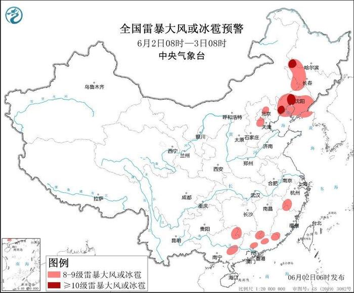 预计6月2日8时至3日8时,东北地区中西部、华北东北部、江南东北部、华南中北部等地的部分地区将有8级以上雷暴大风或冰雹天气,其中,黑龙江西南部、吉林西北部、辽宁中西部等地的部分地区将有10级以上雷暴大风,最大风力可达11级以上,辽宁中西部等地局地不排除出现龙卷的可能性;东北地区中北部、江南中东部、华南中东部、西北地区南部、西南地区北部和南部等地的部分地区将有小时雨量大于20毫米的短时强降水天气,其中,福建东部和南部、云南东南部、广东中南部等地的部分地区小时雨量大于50毫米。
