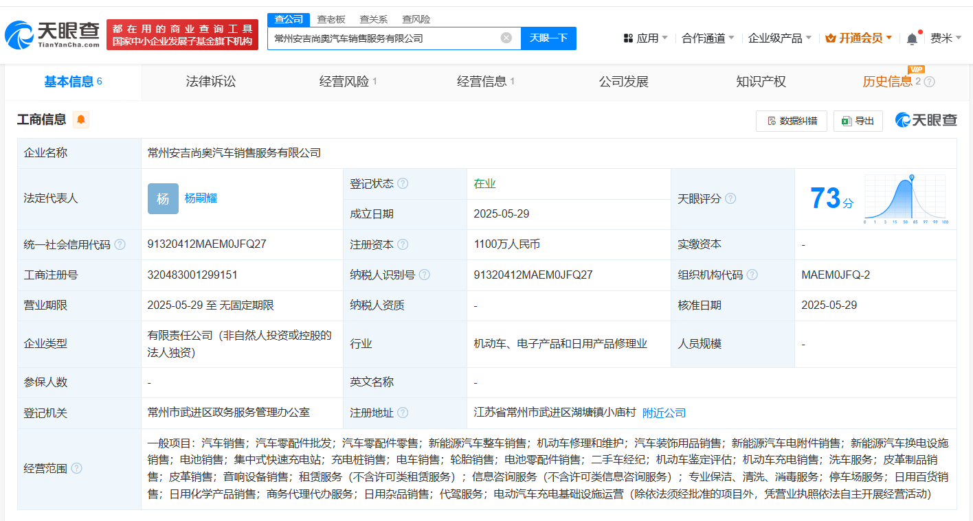 天眼查App显示,近日,常州安吉尚奥汽车销售服务有限公司成立,法定代表人为杨嗣耀,注册资本1100万人民币,经营范围包括汽车销售、汽车零配件批发、汽车零配件零售、新能源汽车整车销售、机动车修理和维护、集中式快速充电站等,由上汽集团(600104)旗下上海汽车工业销售有限公司全资持股。