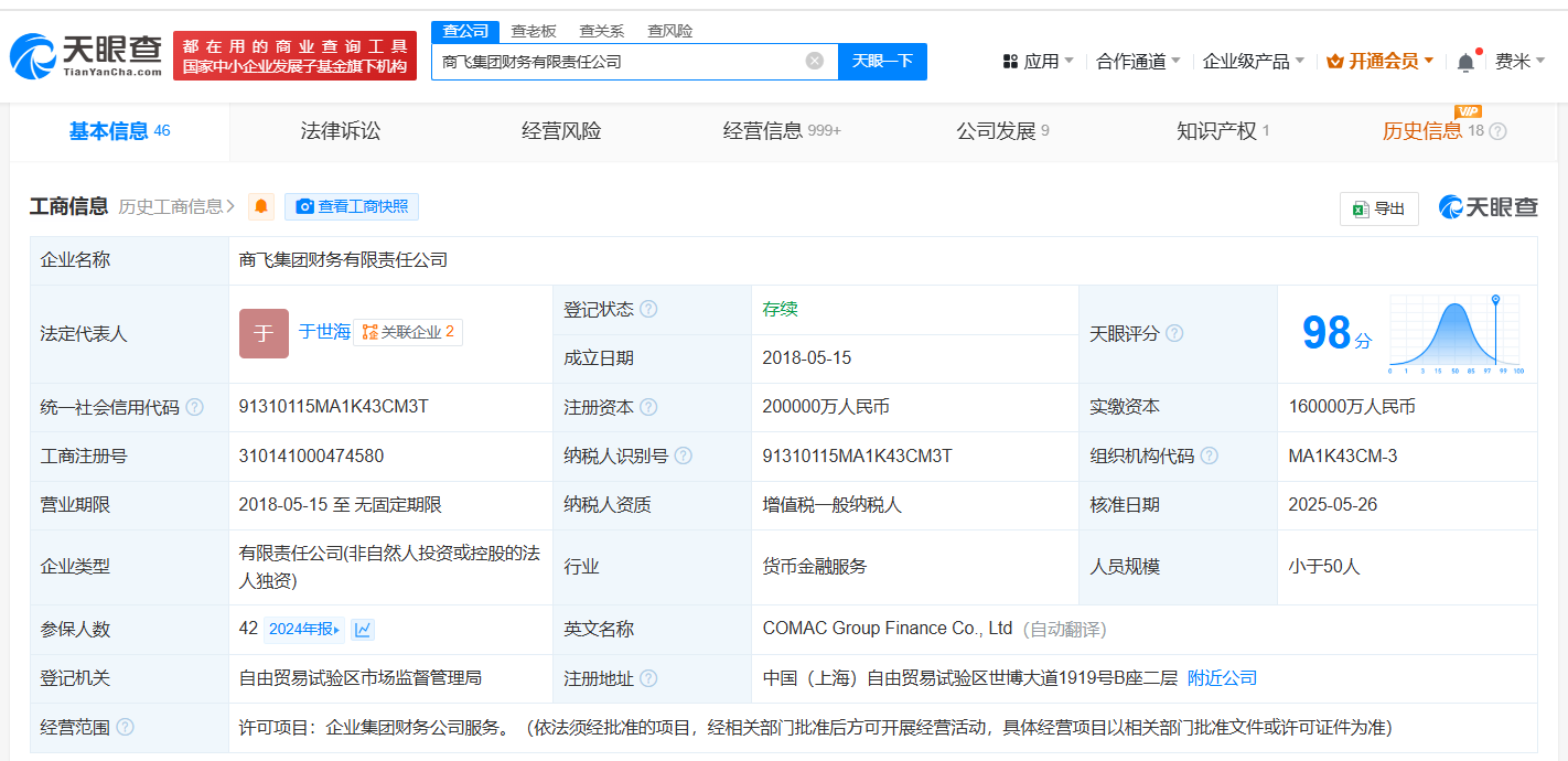 该公司成立于2018年5月,法定代表人为于世海,经营范围为企业集团财务公司服务,由中国商用飞机有限责任公司全资持股。