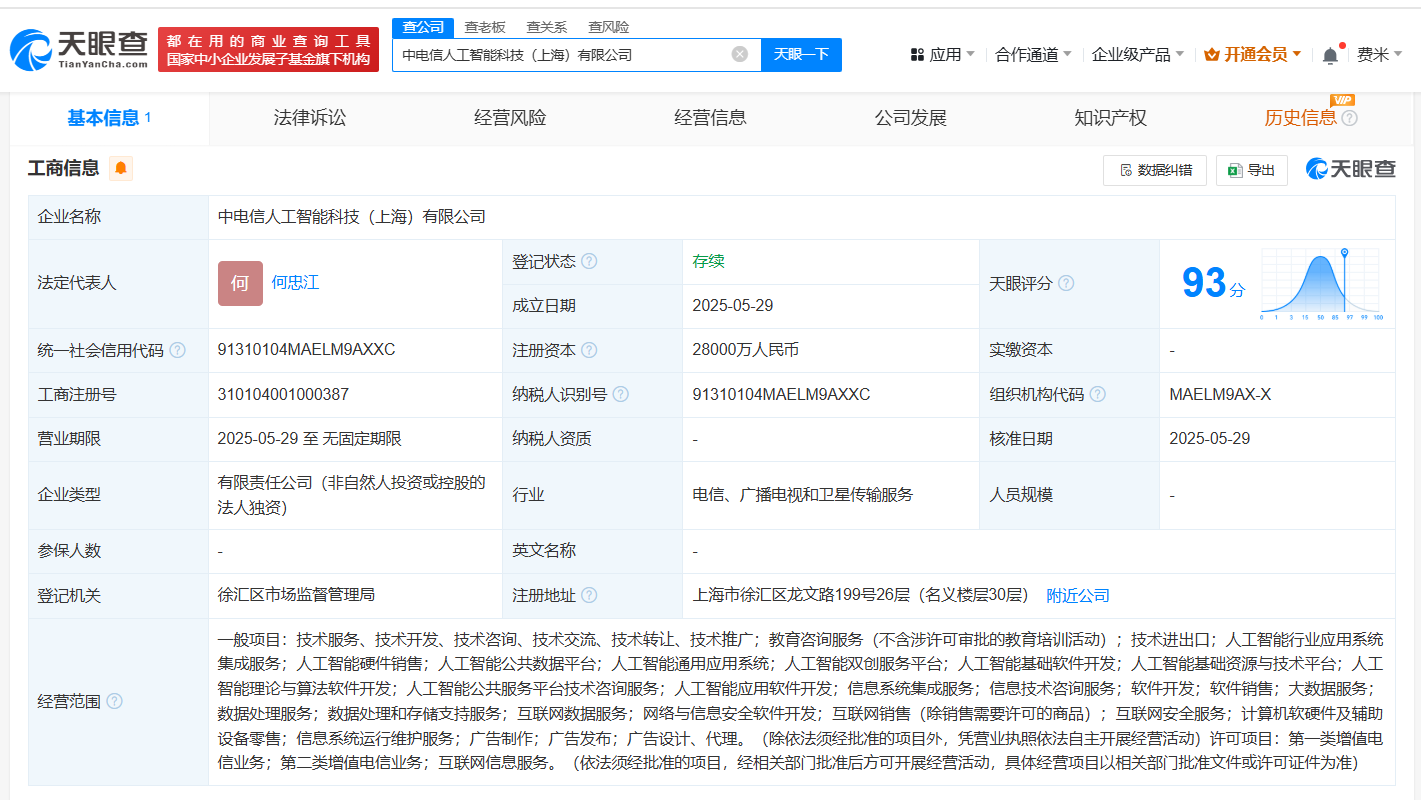 天眼查App显示,近日,中电信人工智能科技(上海)有限公司成立,法定代表人为何忠江,注册资本2.8亿人民币,经营范围包括人工智能行业应用系统集成服务、人工智能硬件销售、人工智能公共数据平台、信息系统集成服务、信息技术咨询服务、大数据服务等,由中国电信(601728)旗下中电信人工智能科技(北京)有限公司全资持股。
