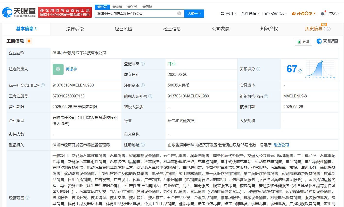 天眼查App显示,近日,淄博小米景明汽车科技有限公司成立,法定代表人为黄振宇,注册资本500万人民币,经营范围包括新能源汽车整车销售、智能车载设备销售、商务代理代办服务、二手车经纪、洗车服务、机动车修理和维护等,由小米景明科技有限公司全资持股。