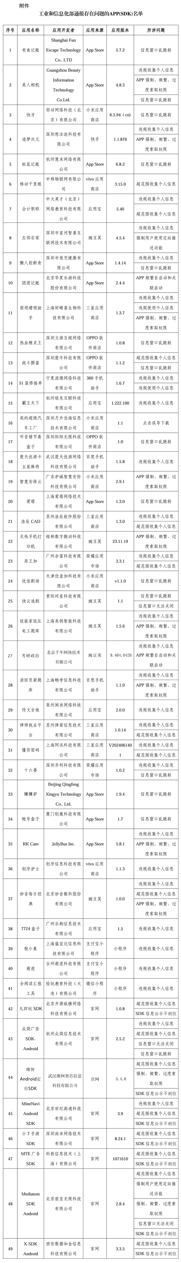 根据中央网信办、工业和信息化部、公安部、市场监管总局等四部门联合发布的《关于开展2025年个人信息保护系列专项行动的公告》,工业和信息化部对APP、SDK违法违规收集使用个人信息等问题开展治理。近期,经组织第三方检测机构进行抽查,共发现49款APP及SDK存在侵害用户权益行为,现予以通报。