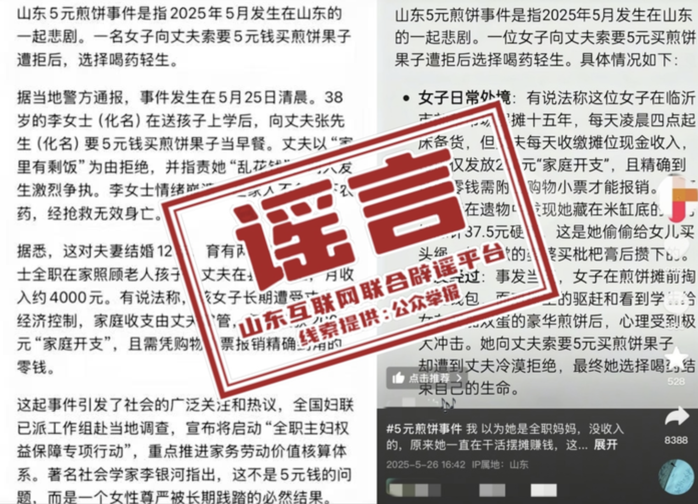 据山东互联网联合辟谣平台消息,近日,网传一则关于“山东一名女子向丈夫索要5元钱买煎饼果子当早餐遭拒后,选择喝药轻生”信息。经向省内各地和有关部门核实,网传信息不实。