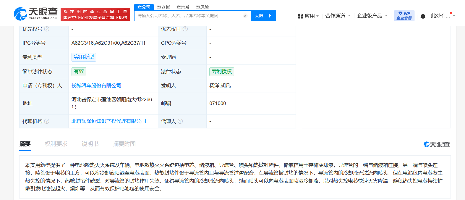 天眼查财产线索信息显示,近日,长城汽车股份有限公司申请的“一种电池散热灭火系统及车辆”专利获授权。