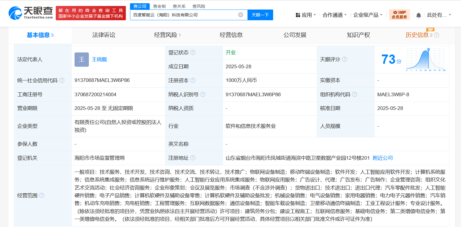 天眼查App显示,近日,百度智能云(海阳)科技有限公司成立,法定代表人为王晓靓,注册资本1000万人民币,经营范围含物联网设备制造、移动终端设备制造、人工智能应用软件开发、计算机系统服务、信息系统集成服务、信息系统运行维护服务、人工智能行业应用系统集成服务、汽车销售等。股东信息显示,该公司由北京百度网讯科技有限公司全资持股。