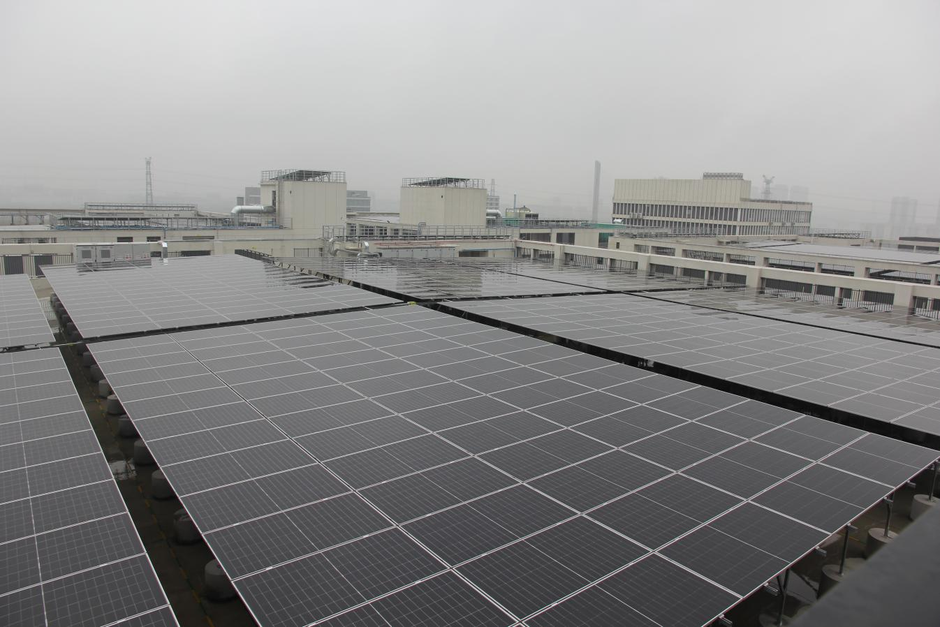 川崎汽车零部件有限公司产业园区楼顶的太阳能光伏板。