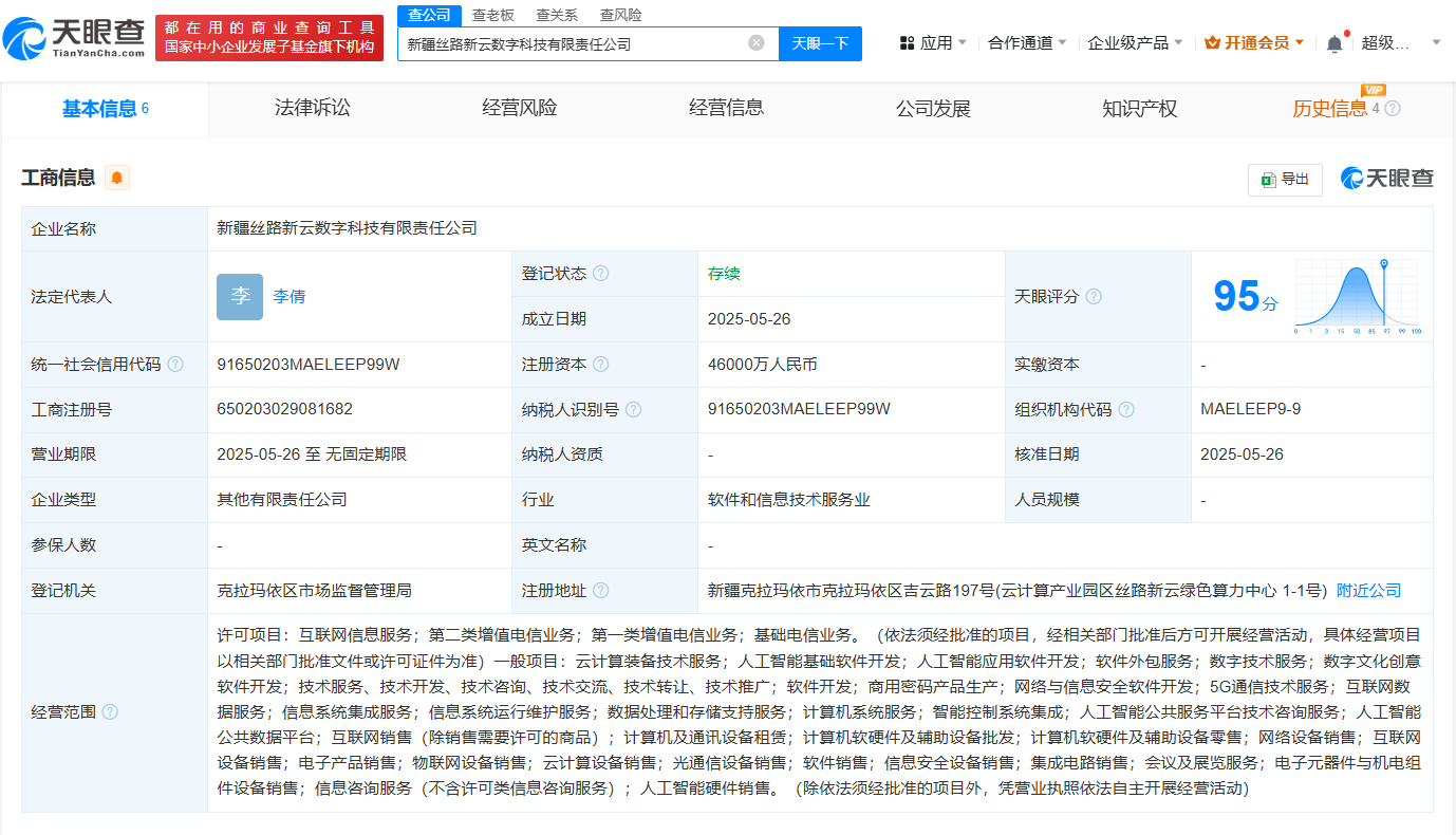 天眼查App显示,近日,新疆丝路新云数字科技有限责任公司成立,法定代表人为李倩,注册资本4.6亿人民币,经营范围包括云计算装备技术服务、人工智能基础软件开发、人工智能应用软件开发、人工智能公共数据平台等。股东信息显示,该公司由克拉玛依市云计算产业投资开发有限公司、奥瑞德(600666)共同持股。