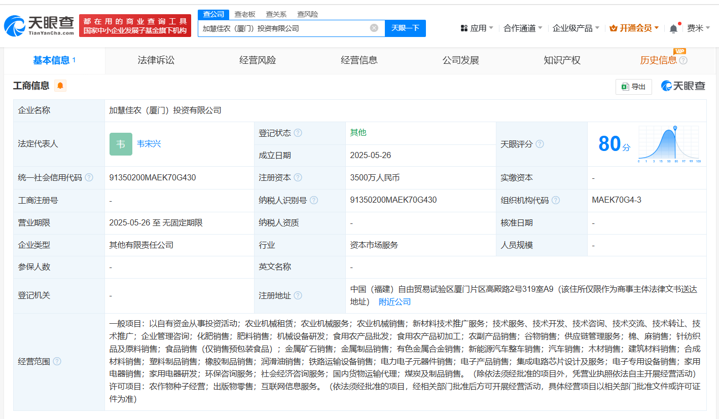 天眼查App显示,近日,加慧佳农(厦门)投资有限公司成立,法定代表人为韦宋兴,注册资本3500万人民币,经营范围包括以自有资金从事投资活动、农业机械租赁、农业机械服务、农业机械销售、新材料技术推广服务、企业管理咨询等,由国家制造业转型升级基金股份有限公司全资持股。