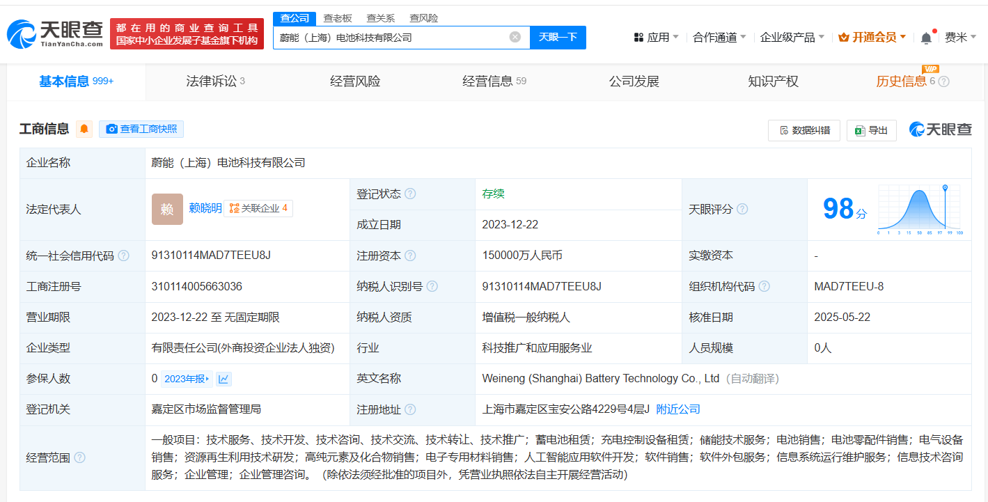 该公司成立于2023年12月,法定代表人为赖晓明,经营范围包括蓄电池租赁、充电控制设备租赁、储能技术服务、电池销售、电池零配件销售、资源再生利用技术研发等。股东信息显示,该公司由武汉蔚能电池资产有限公司全资持股,后者由蔚来控股有限公司、宁德时代(300750)、武汉光谷产业投资有限公司等共同持股。