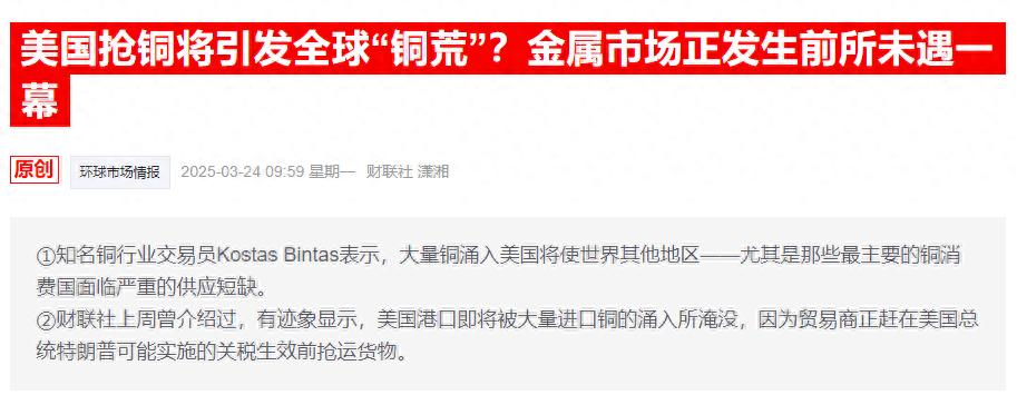 财联社今年3月时曾报道过,特朗普对进口铜征收关税的威胁,在一季度曾一度导致大量金属转道美国。知名铜行业交易员Kostas Bintas在当时就曾指出,库存向美国的转移意味着中国铜市场将面临库存不足。占全球需求过半的中国买家将被迫与美国市场争夺资源。与此同时,通常从美国流出的大量废铜供应已基本枯竭。