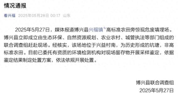 山东滨州市博兴县联合调查组通报,5月27日,媒体报道博兴县兴福镇高标准农田旁惊现危废填埋场。博兴县立即成立由生态环保、自然资源规划、农业农村、城管执法等部门组成的联合调查组赶赴现场。经核实,该场地位于兴益村南,为历史形成的坑塘,非高标准农田。目前已委托有资质的环境检测机构对现场留存物开展采样鉴定,依据鉴定结果制定处置方案,依法依规开展处置。