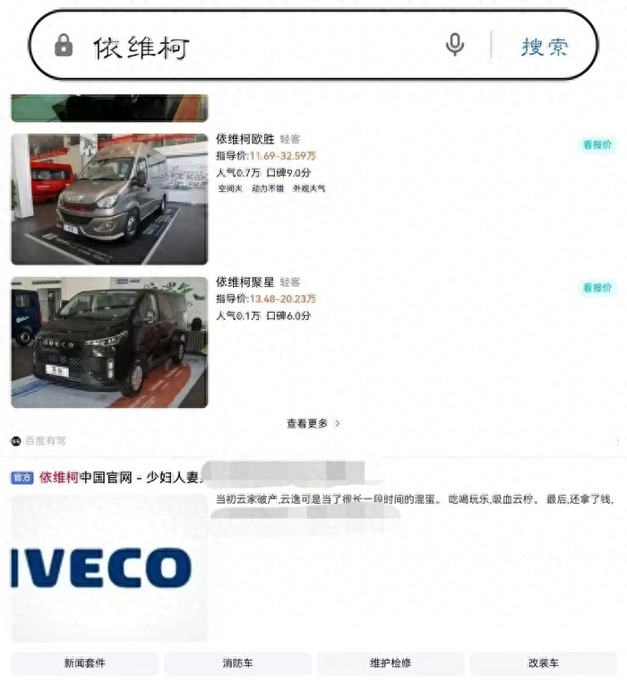 5月27日下午,有车友群传出汽车制造商依维柯(中国)官网(www.iveco.com.cn)疑似被攻击、篡改的图片。记者查询发现,在搜索引擎结果中,原本应该显示“依维柯中国官网-依维柯进口车”字样的地方,却出现了“少妇人妻……”等低俗内容。