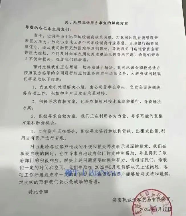 4月17日,济南乾城汽车贸易有限公司(以下简称“济南乾城”)发布了《关于处理三保服务事宜的解决方案》公告,公告表示,“近两年由于比亚迪经销商政策调整,对我司的现金流管理带来巨大压力。加之山东地区多个汽车经销商行业暴雷,当地银行融资政策保守,造成我司融资更加困难等系列影响,导致我司门店运营资金面临巨大挑战,不能及时向车友朋友处理退还三保费用问题”。