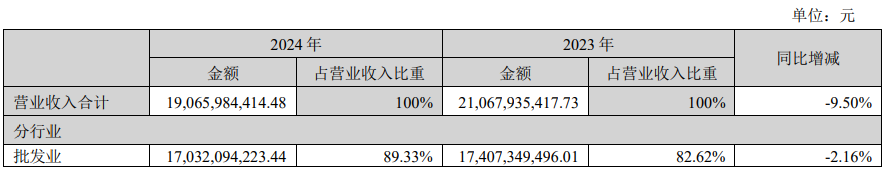 分行业来看,批发业收入占比近九成,房地产业、纺织产品销售业及其他占比较小。批发业主要为能源贸易业务收入,该产业领域收入模式为有色金属等大宗商品批���业。