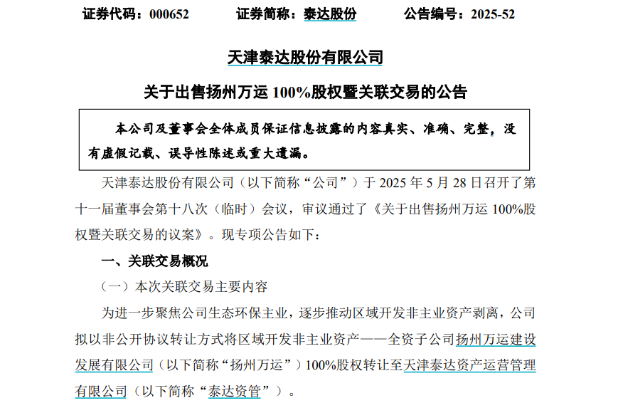 5月28日晚间,泰达股份发布公告称,为进一步聚焦公司生态环保主业,逐步推动区域开发非主业资产剥离,公司拟将所持扬州万运建设发展有限公司(以下简称扬州万运)100%股权以非公开协议转让方式转让至公司关联方天津泰达资产运营管理有限公司(以下简称泰达资管)。