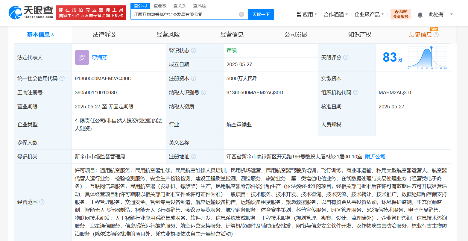 天眼查App显示,近日,江西开物数智低空经济发展有限公司成立,法定代表人为罗海燕,注册资本5000万人民币,经营范围含通用航空服务、民用航空器维修、民用航空维修人员培训、民用机场运营、民用航空器驾驶员培训、航空器代管人运行业务、智能无人飞行器制造等。股东信息显示,该公司由新余市袁河科技有限公司全资持股。