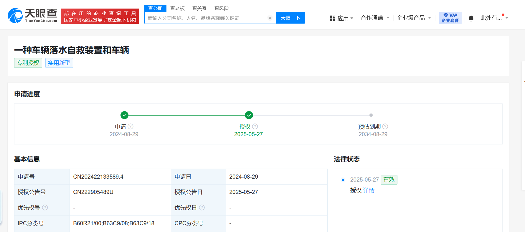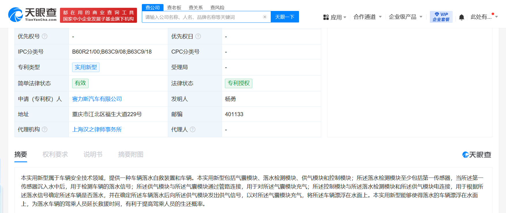 天眼查知识产权信息显示,近日,赛力斯汽车有限公司申请的“一种车辆落水自救装置和车辆”专利获授权。摘要显示,该实用新型专利属于车辆安全技术领域,能够使得落水的车辆漂浮在水面上,为落水车辆的驾乘人员延长救援时间,有利于提高驾乘人员的生还概率。