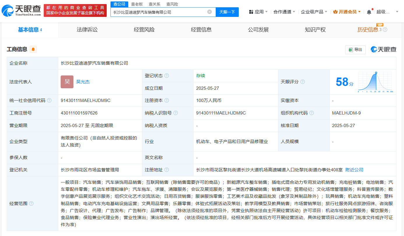 天眼查App显示,近日,长沙比亚迪迪梦汽车销售有限公司成立,法定代表人为吴允杰,注册资本100万人民币,经营范围包括新能源汽车整车销售、电桩销售、电池销售、汽车零配件零售等。股东信息显示,该公司由比亚迪汽车工业有限公司全资持股。
