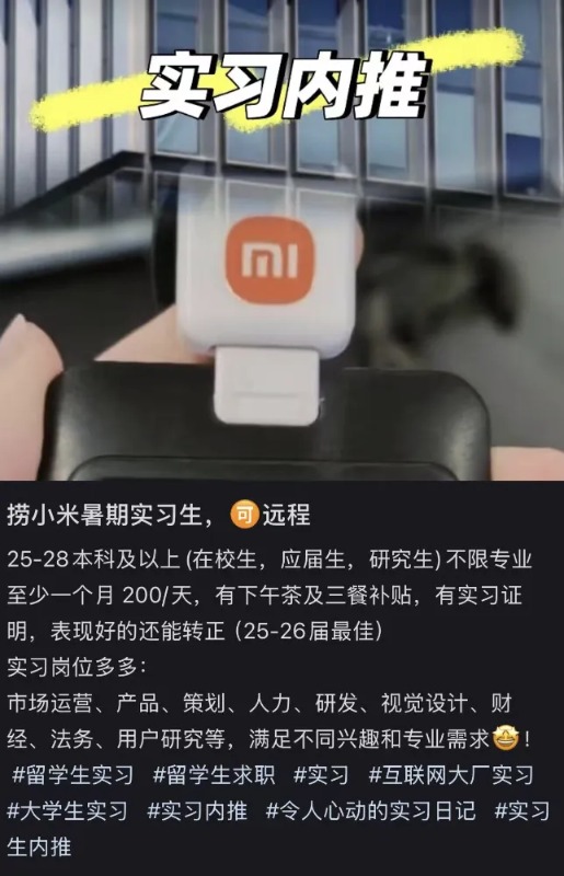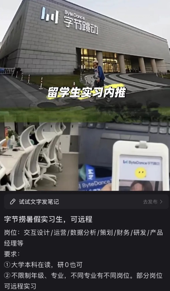 不仅如此,岗位也具有多样性,从市场运营、产品、活动策划、人力资源,到技术研发、视觉设计,再到金融领域的审计、税务、咨询等核心岗位,几乎覆盖了应届生求职的所有热门方向。中介在推文中强调:“本科研0皆可,不限年级、不限专业,我们都能匹配到对口实习甚至可以远程实习。”