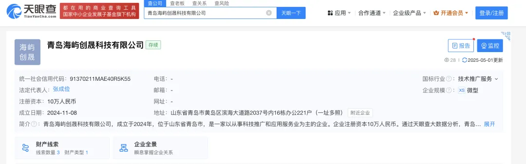 记者根据该账号详情查到了中介所属的公司“青岛海屿创晟科技有限公司”。天眼查显示,该公司成立于2024年11月,注册资本10万元,法定代表人为张成俭。