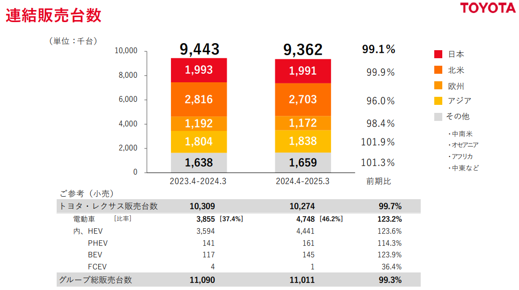 丰田也表示,将继续推进电动化和多路径战略,以满足全球市场的多样化需求。在2024财年,丰田全球销量为1027.4万辆。其中,纯电动车销量为14.5万辆,占比仅为1.4%;插电式混合动力车销量为16.1万辆,占比仅为1.57%;油电混合动力车销量为444.1万辆,占比为43%。