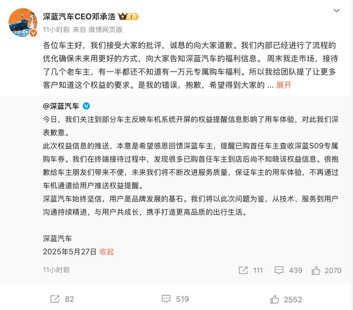 随后,深蓝汽车CEO邓承浩转发此文并再次道歉,“我们接受大家的批评,诚恳的向大家道歉。我们内部已经进行了流程的优化确保未来用更好的方式,向大家告知深蓝汽车的福利信息。”