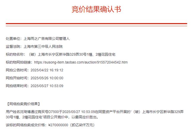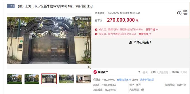 阿里拍卖网站显示,27日上午,位于上海市长宁区新华路329弄30号1幢、2幢的花园住宅,以2.7亿元的价格拍出。