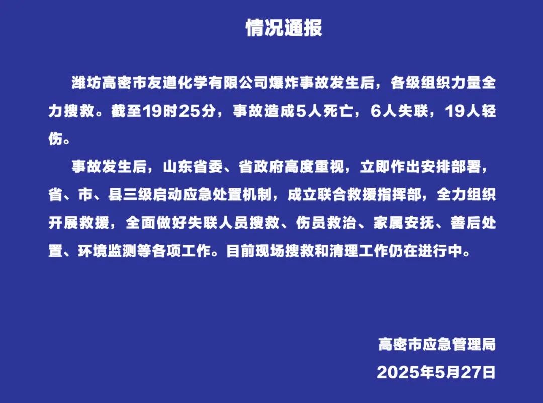 山东高密市应急管理局发布情况通报:5月27日11时57分左右,山东高密友道化学有限公司一车间发生爆炸事故。事故发生后,各级组织力量全力搜救。截至19时25分,事故造成5人死亡,6人失联,19人轻伤。
