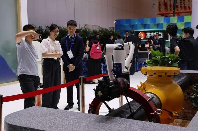 5月21日,参展观众在北京燃气集团智能焊接装备前驻足。 实习生 杨丽/摄
