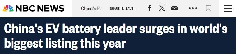 在电动汽车电池领域,中国同样展现出强大的实力。美国全国广播公司(NBC News)近期报道称,中国新能源企业宁德时代5月20日在香港上市,是今年以来全球规模最大的上市交易,再次表明中国清洁能源企业在与美国同行的竞争中优势���益凸显,国际投资者仍对这家公司展现出的潜力青睐有加。