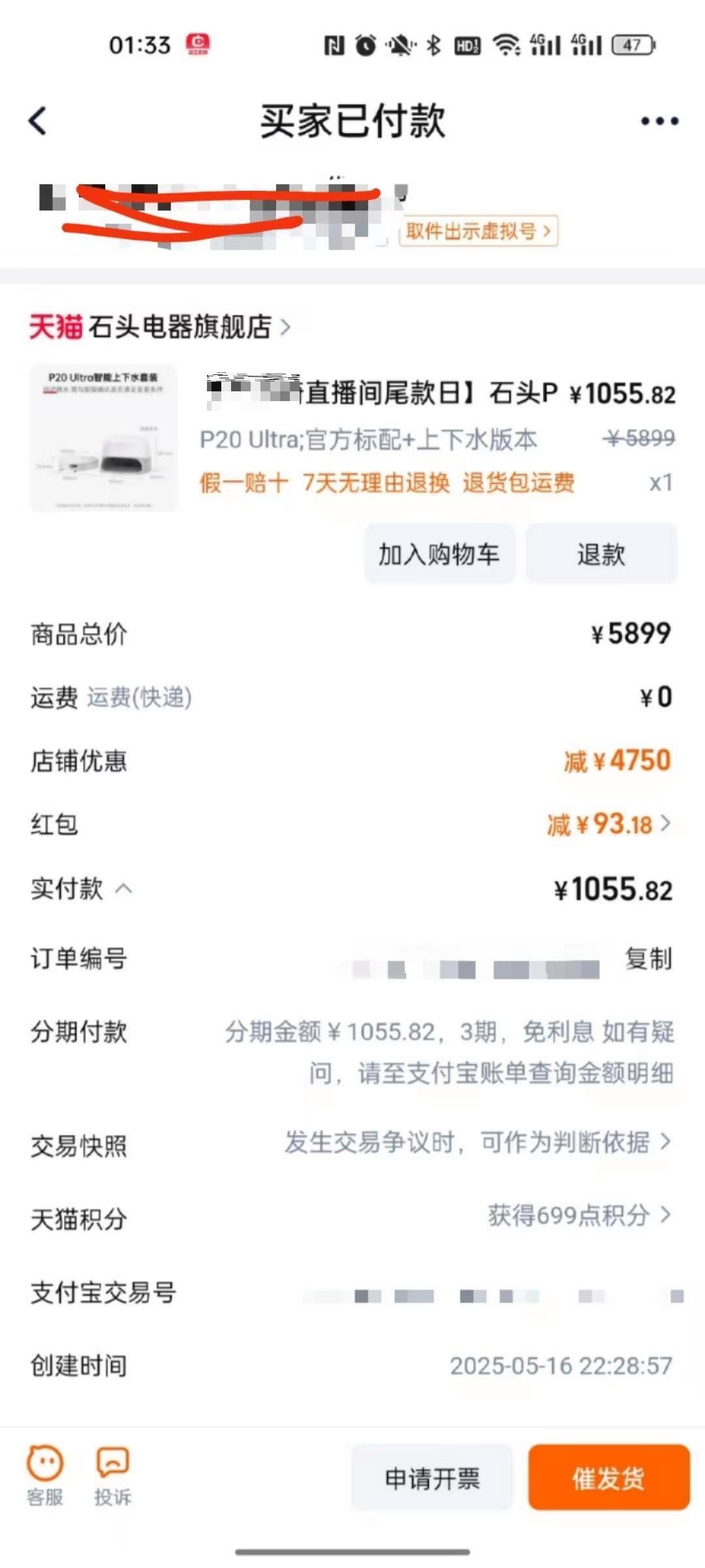 5月20日,张女士介绍,她于5月16日在直播间以1055.82元的价格下单了石头扫地机器人P20Ultra。此后,店铺拒绝发货。
