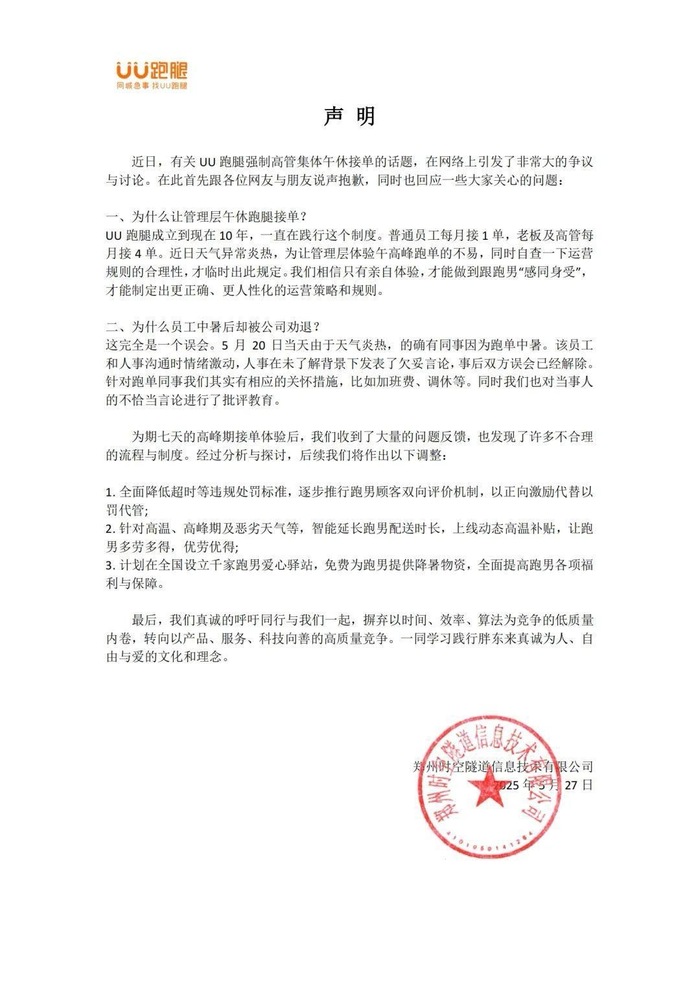 针对部分网友质疑 “强制占用休息时间” 的问题,UU跑腿表示,会为参与接单的高管提供调休和加班费补偿。同时,公司承认在执行过程中存在沟通疏漏,5月20日,由于某员工因中暑与人事部门产生误会,人事在未了解背景下发表了欠妥言论,目前双方已达成和解。