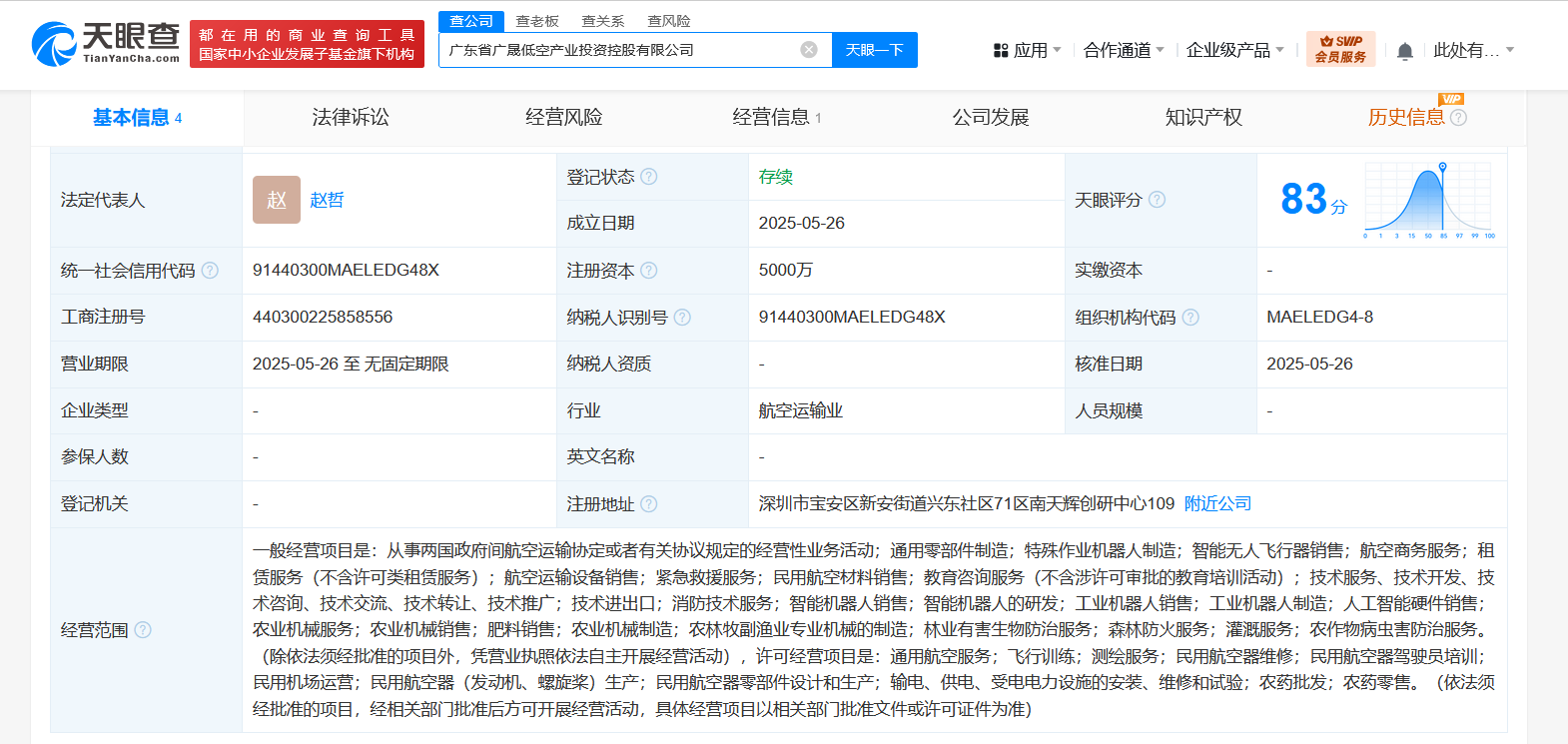 天眼查App显示,近日,广东省广晟低空产业投资控股有限公司成立,法定代表人为赵哲,注册资本5000万人民币,经营范围含通用零部件制造、智能无人飞行器销售、智能机器人销售、智能机器人的研发、工业机器人销售、通用航空服务、民用机场运营、民用航空器零部件设计和生产等。股东信息显示,该公司由广东省广晟应急安全科技有限责任公司全资持股。