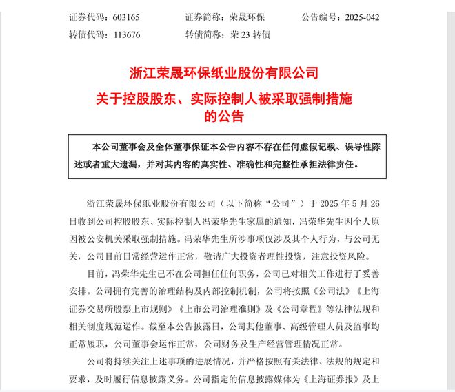 5月27日消息,5月26日,纸业上市公司荣晟环保(603165.SH)公告称,接到控股股东、实际控制人冯荣华被公安机关采取强制措施的通知,上述事件是冯荣华“个人行为”所导致。