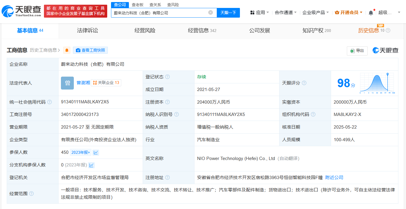该公司成立于2021年5月,法定代表人为曾澍湘,经营范围包括汽车零部件及配件制造、货物进出口、技术进出口等,由蔚来驱动科技控股(安徽)有限公司全资持股。
