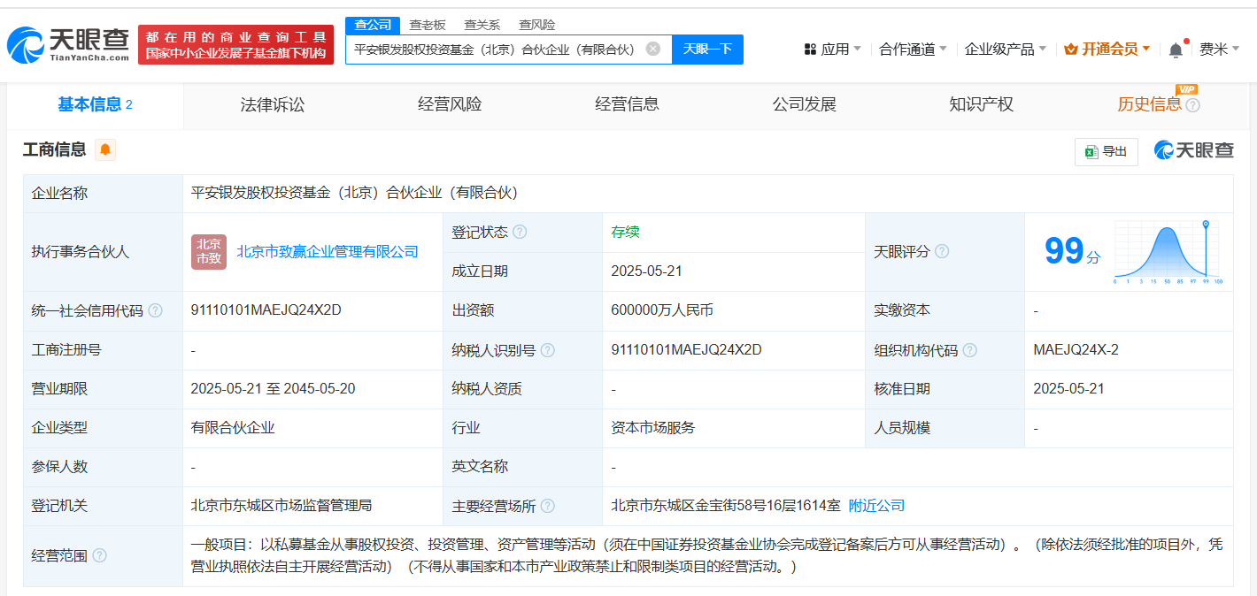 天眼查App显示,近日,平安银发股权投资基金(北京)合伙企业(有限合伙)成立,执行事务合伙人为北京市致赢企业管理有限公司,出资额60亿人民币,经营范围为以私募基金从事股权投资、投资管理、资产管理等活动,由中国平安人寿保险股份有限公司、北京市致赢企业管理有限公司共同出资。