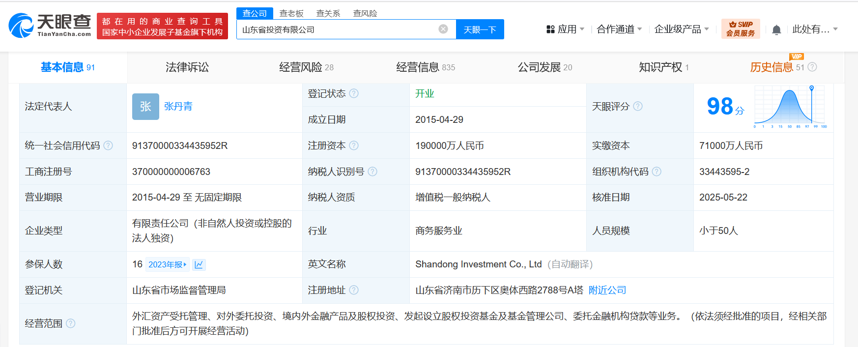 天眼查App显示,近日,山东省投资有限公司发生工商变更,注册资本由7.1亿人民币增至19亿人民币,增幅约168%。