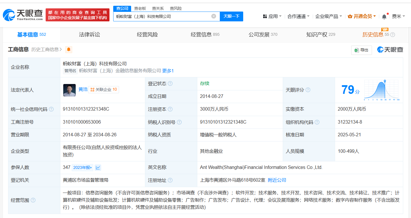 该公司成立于2014年8月,法定代表人为黄浩,注册资本3000万人民币,由蚂蚁集团旗下上海云进信息技术有限公司全资持股。公开资料显示,该公司是蚂蚁金服旗下的一站式智慧理财平台,与支付宝、余额宝、招财宝等同为蚂蚁金服旗下的业务板块。