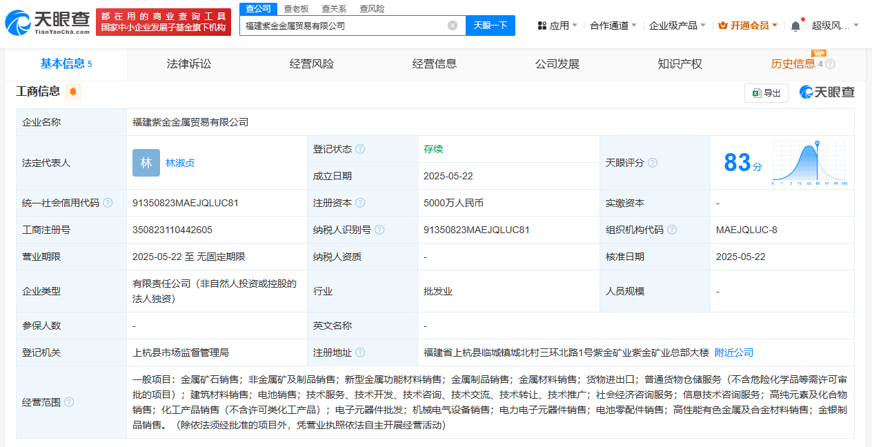 天眼查App显示,近日,福建紫金金属贸易有限公司成立,法定代表人为林淑贞,注册资本5000万人民币,经营范围包括金属矿石销售、非金属矿及制品销售、新型金属功能材料销售、金属制品销售等,由紫金矿业集团股份有限公司全资持股。