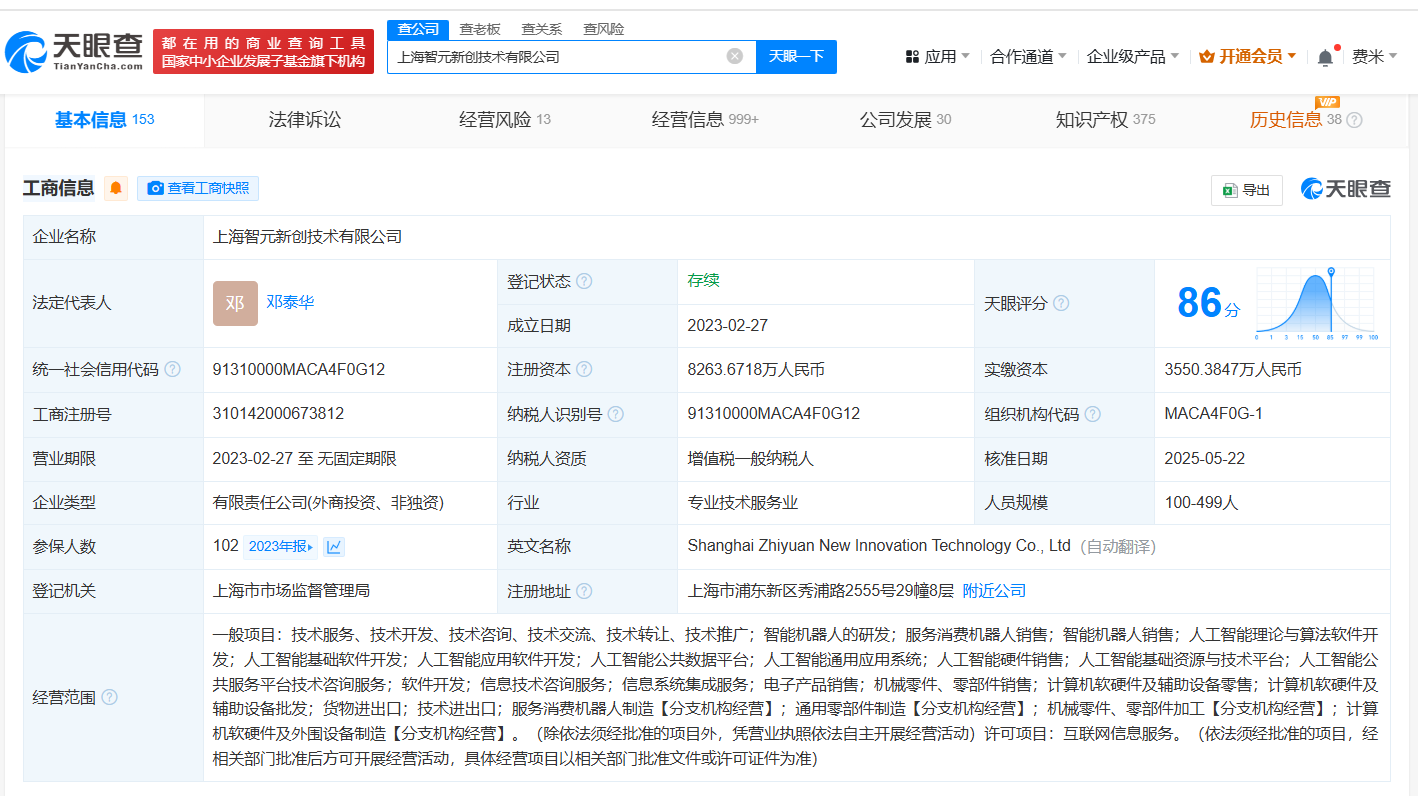 上海智元新创技术有限公司成立于2023年2月,法定代表人为邓泰华,经营范围包括智能机器人的研发、服务消费机器人销售、人工智能理论与算法软件开发等,现由舒远春、比亚迪股份有限公司及上述新增股东等共同持股。