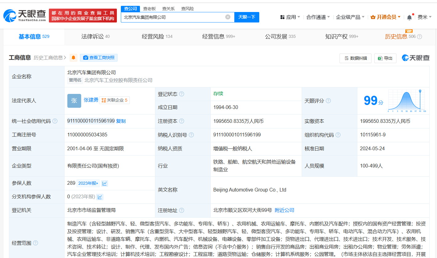 北京汽车集团有限公司成立于1994年6月,法定代表人为张建勇,注册资本约199.6亿人民币,经营范围包括汽车企业管理技术培训、计算机技术培训、工程勘察设计等,由北京国有资本运营管理有限公司全资持股。