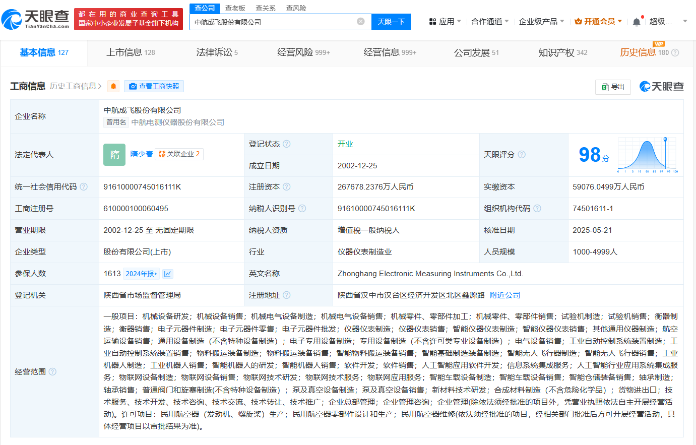 该公司成立于2002年12月,法定代表人为隋少春,经营范围包括机械设备研发、机械设备销售、智能无人飞行器制造等,由中国航空工业集团有限公司、汉中汉航机电有限公司等共同持股。