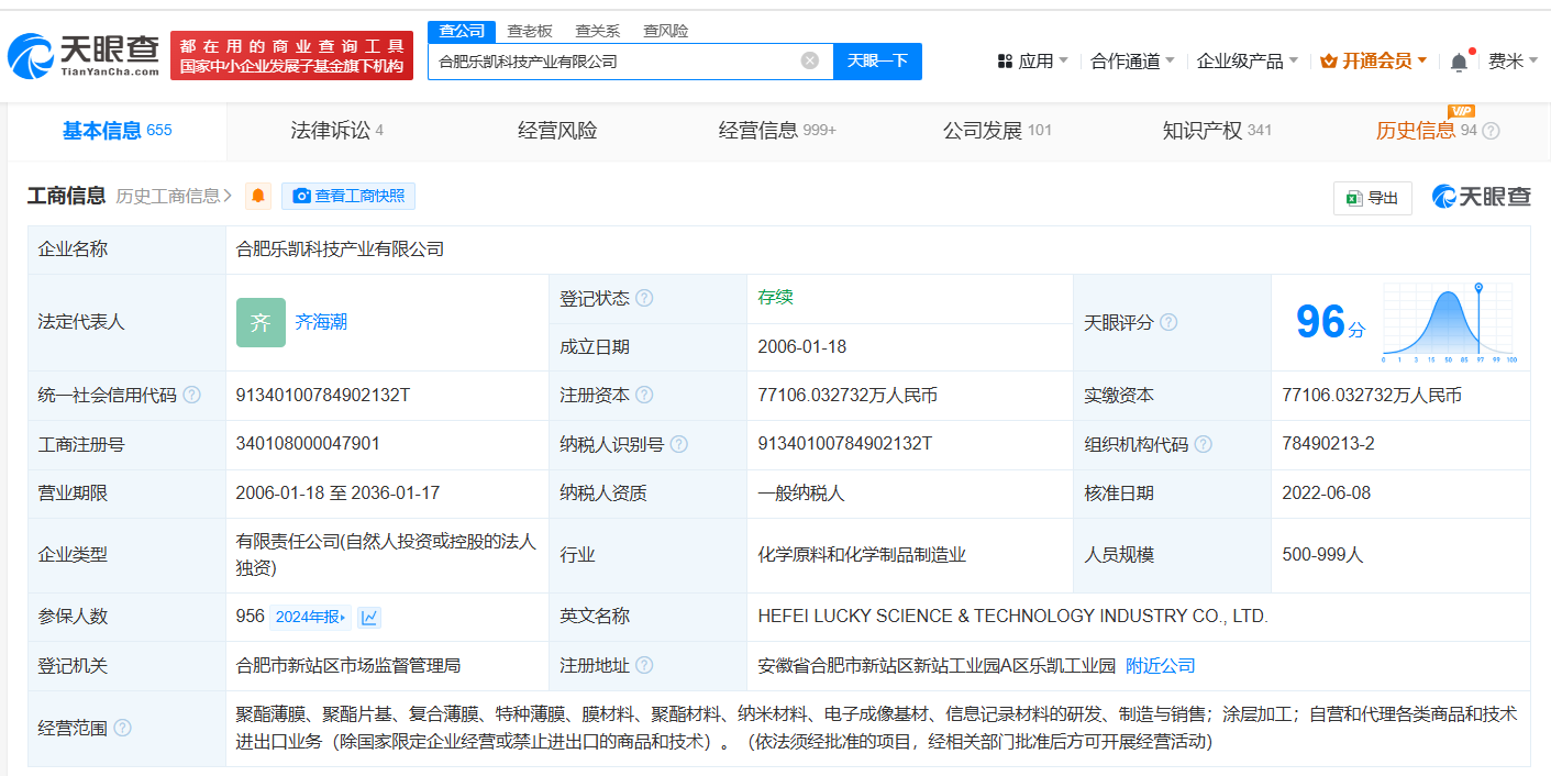 该公司成立于2006年1月,法定代表人为齐海潮,经营范围包括聚酯薄膜、聚酯片基、复合薄膜、特种薄膜、膜材料、聚酯材料、纳米材料、电子成像基材、信息记录材料的研发、制造与销售等,现由中国乐凯集团有限公司及上述新增股东共同持股。官网显示,该公司从事光学聚酯薄膜及功能膜材料的科研开发与生产。