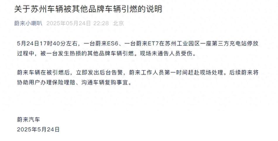 5月24日晚,蔚来官方“蔚来小喇叭”发布情况说明:5月24日17时40分左右,一台蔚来ES6、一台蔚来ET7在苏州工业园区一座第三方充电站停放过程中,被一台发生热损的其他品牌车辆引燃,现场未通告人员受伤。蔚来车辆在被引燃后,立即发出后台告警,蔚来工作人员第一时间赶赴现场处理。后续蔚来将协助用户办理保险理赔、沟通车辆复购事宜。
