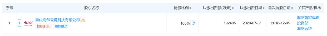 从股权来看,重庆海尔小贷为海尔集团(青岛)金盈控股有限公司(下称“海尔金控”)孙公司,由海尔金控全资子公司重庆海尔云链科技有限公司100%控股。