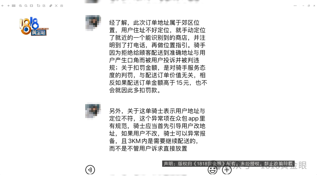 饿了么骑手服务热线:用户这边的话是定位下错了,那咱们可以按照平台要求正常报备。我这边也核实了,用户这边一直在跟这个骑手友好地沟通,说你稍微再往前走一点。
