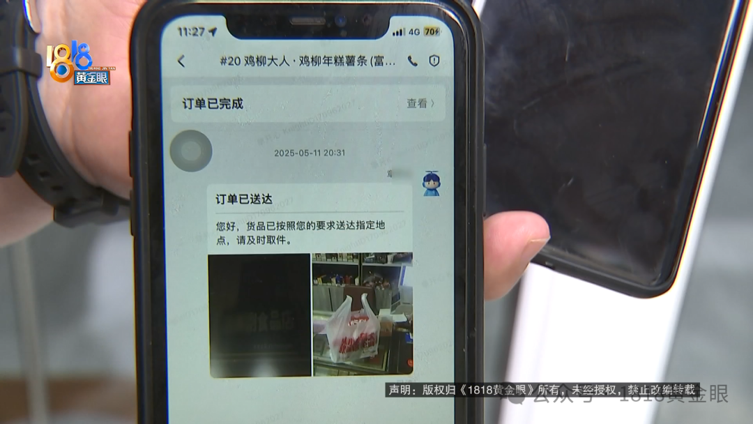 小章在跟顾客的沟通记录里留下了送达提醒,并发了副食店的招牌,以及外卖放在柜台上的照片。