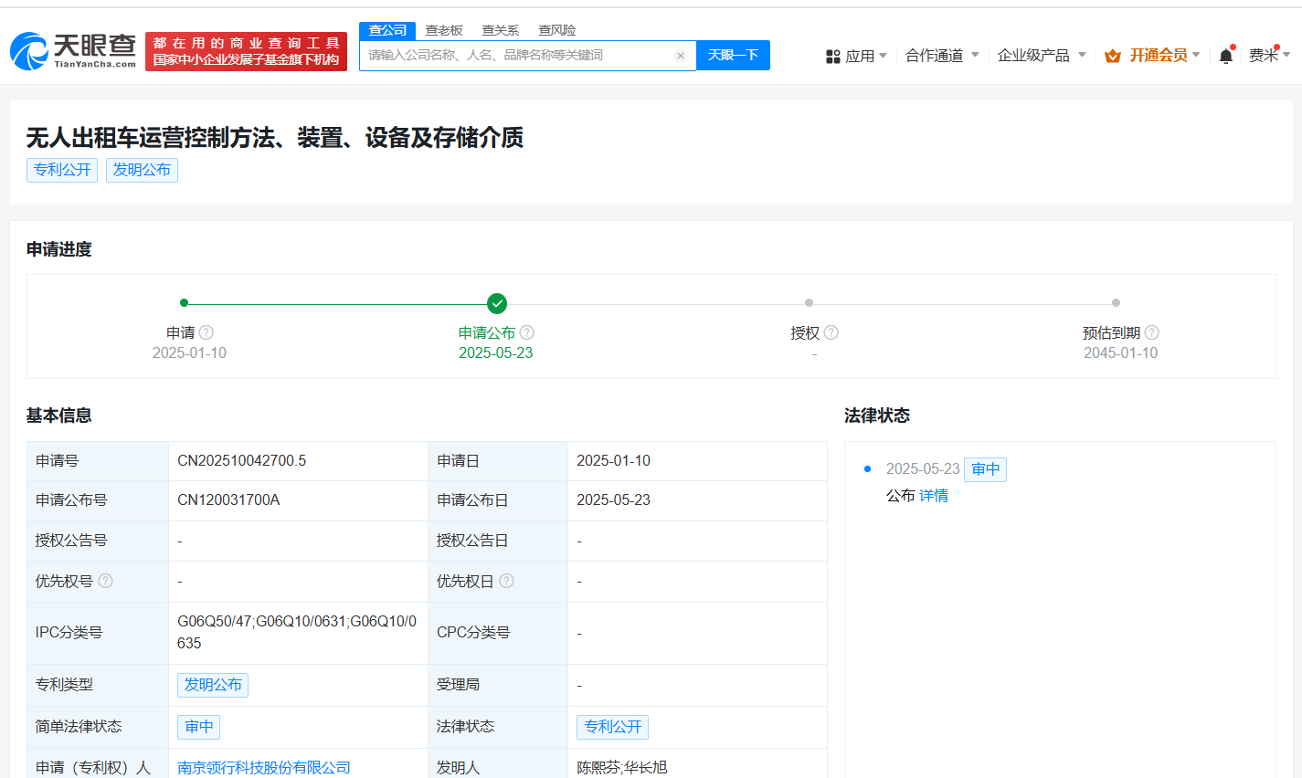 天眼查财产线索信息显示,近日,T3出行关联公司南京领行科技股份有限公司申请的“无人出租车运营控制方法、装置、设备及存储介质”专利公布。